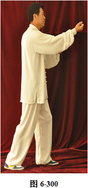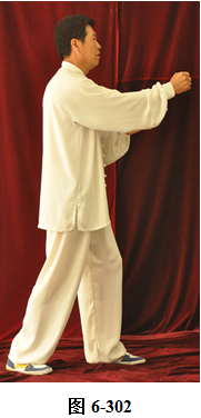 接上式,腰微含,收回蹬出的右脚落于右前方。腰微含右转, 重心回至左腿,左膝微弓,右掌变拳,左掌同向右下划弧回撤,收至右侧胯旁。左手掌搭于右手腕部,向右前下打挤;腰微上提 两臂向前向左向里划弧,右拳拳心向上,左掌心向下,运划至右膝前, 两手与右膝成三角形,重心渐渐移于右腿;腰微拱,随之微向右转, 随转体,右拳自右肋旁而上经胸前向前搬出。随搬臂外旋,使拳心慢慢翻转朝上,随即渐渐向下弧形收回。左掌同时随转体,划弧向右经右臂里侧前拦;左腰微提,左脚前上一步,同时腰微含向右转, 身体继续右转,随转体,左掌向前探出。腰微拱,右拳划弧收回腰肋旁,拳心朝上。随着腰上提向左转,重心渐渐移于左腿,成左弓步。同时身体渐渐左转,随转体,右拳向前打出,拳眼朝上。左手指尖朝前上,置于右小臂内侧,眼向前平视(见图6-298至6-302)。