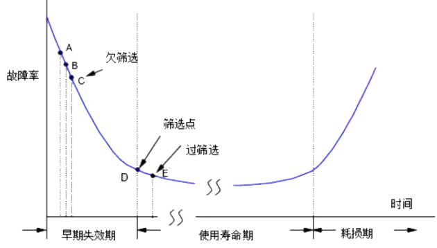 老化的理论基础是电子产品的故障率曲线(简称浴盆曲线),如图8-8所示。老化以暴露潜在缺陷、剔除早期故障为目标,图中的A、B、C点均表示老化程度不足,老化后仍有较大概率的缺陷流入市场。