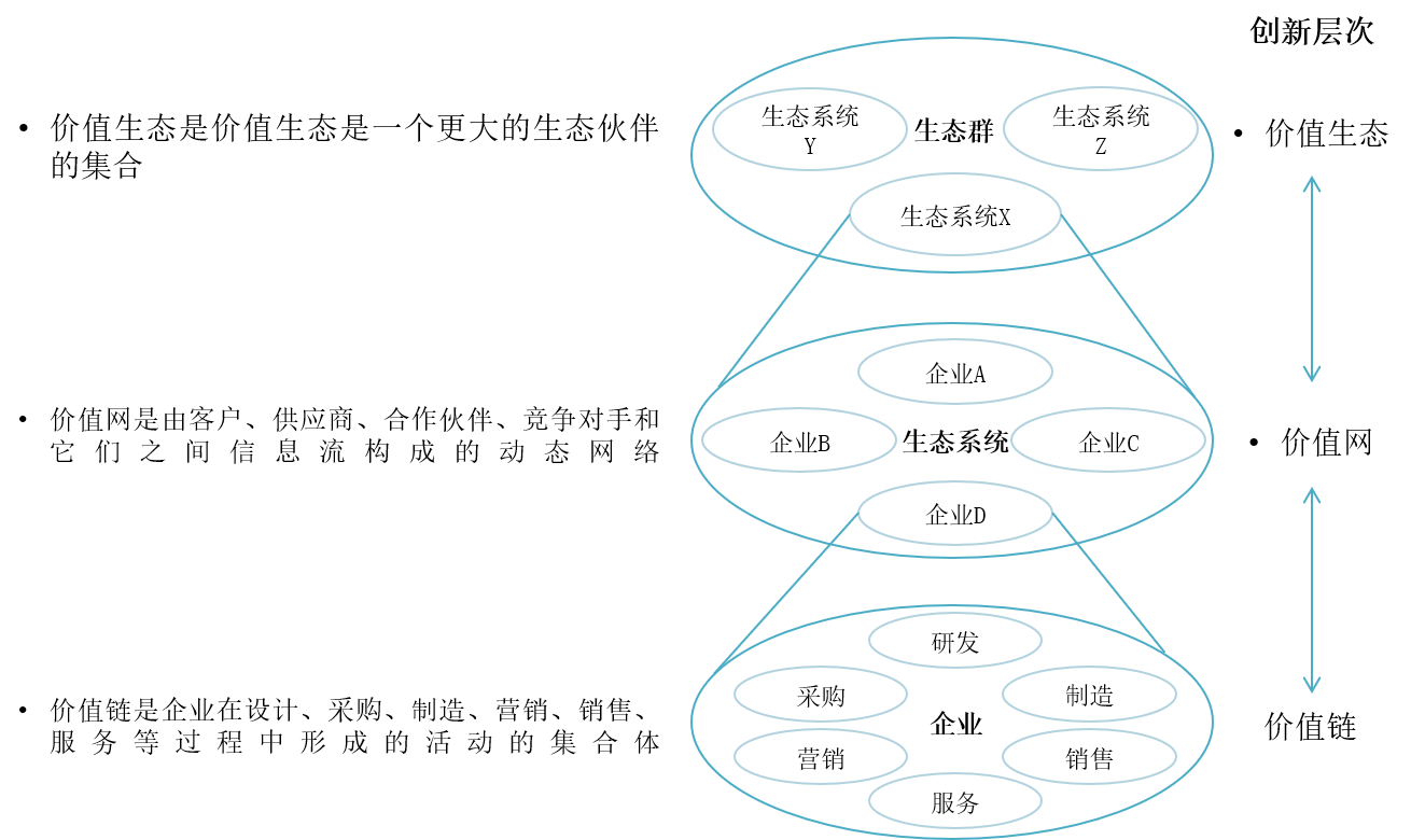 图11-1中显示了创新的三个层次,我们首先来定义一下价值链、价值网、价值生态的含义: