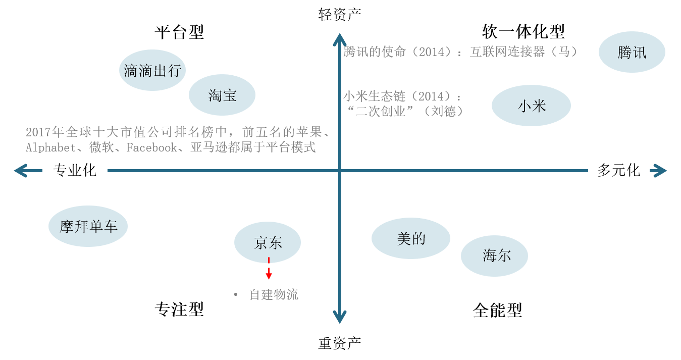 商业模式创新是比战略创新成为更高一个层次的创新。按业务来划分,商业模式可以分为四种(如图11-2所示):软一体化型、全能型、专注型和平台型,横轴表示产品和服务的覆盖范围(专业化——一体化),纵轴表示自有资源能力杠杆率的大小(重资产——轻资产)。