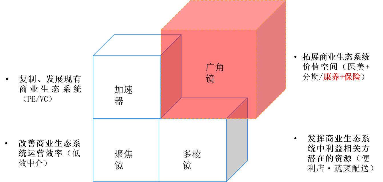 ①广角镜是拓展商业生态系统价值空间,例如医美+分期/康养+保险。