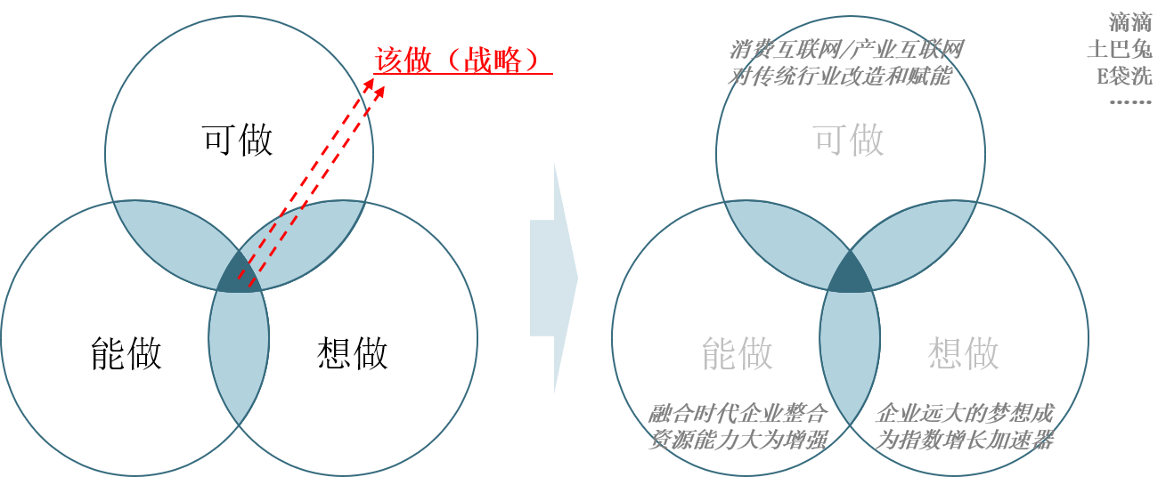 为了赢得胜利,因此企业创新设计的视野就要超越价值链之外,关注价值网和价值生态层面的创新。安德鲁斯经典著作《公司战略概念》(1971年),首次提出“匹配”的思想(战略=可做(might do)+能做(can do),其影响深远(曾鸣也说过:战略=该做=可做+能做+想做);战略=可做、能做、想做的结合。这依然是对的,只是内涵发生了一些变化(如图11-5所示):企业的边界由于是模糊的,资源和能力可能存在于供应商、合作伙伴、竞争对手、客户,甚至与直接利益相关者无关的另外一个生态系统中,由于(移动)互联网的存在及资源知识化(即知识取代资金、设备等成为资源的主要载体),交易成本已经降到前所未有的程度,因此通过巧妙地设计这些资源和能力就可以为我所用(滴滴就是一个典型案例)。
