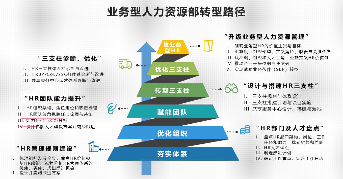 3.业务型 HR(三阶):以三支柱为框架,BP 与业务深度融合,仅 20%-30% 企业实现。