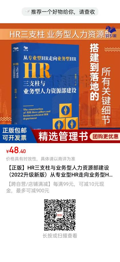 不同于理论化论述,本书聚焦落地方法论,涵盖体系搭建、组织优化、团队赋能等实操步骤,提供诊断问卷、流程模板、能力测评表等工具包,帮助读者快速对标现状、制定转型计划。无论是 HR 从业者提升专业能力,还是企业推动人力资源管理升级,本书都能提供兼具前瞻性与实用性的指导,堪称业务型 HR 建设的 “行动指南”。