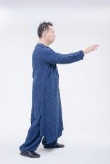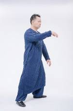 3.右脚踩下将重心平移至左脚心,同时右手画半圆荡至右前胸外侧,右手腕放松,五指要有看起来往下插,但实际并没有用力插的感觉,只是手腕自然放松即可。右肘不超过肩膀高度,左手松掉护裆于左腿内侧。