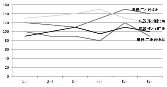 图6-10 各"货物类型+路由"上半年每月收入趋势折线图