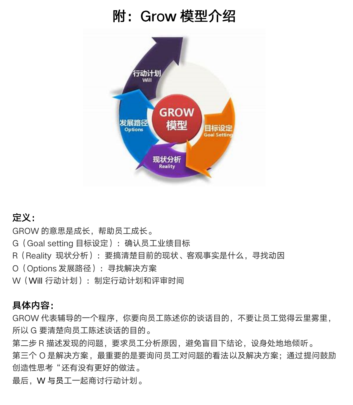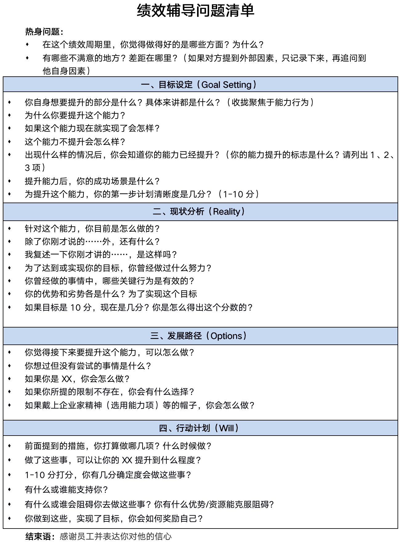 在绩效执行的过程中,最关键、最重要、最困难的工作就是绩效辅导沟通。绩效辅导沟通是一个充满细节的过程,是直线管理者与下属员工在共同工作的过程中分享各类与绩效有关的信息的过程。这些信息包括有关工作进展情况的信息、有关员工工作中潜在障碍和问题的信息及各种的可能的解决措施等。直线管理者应对下属员工进行定期的、持续的辅导,以便在某些困难发生前帮助下属员工识别并指出困难,避免其在工作中走弯路。在辅导过程中,沟通不良会使管理者与员工之间产生各种各样的摩擦。因此,在管理者与员工之间进行与绩效相关的辅导沟通时,可以结合教练的工具GROW模型进行辅导。
