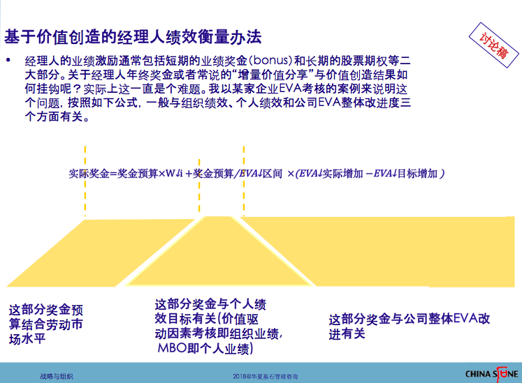 另一方面,要重视它跟奖金之间的挂钩。最终通过考核模式设计,引导职业经理人的高绩效行为,这是价值增量分享的本意。