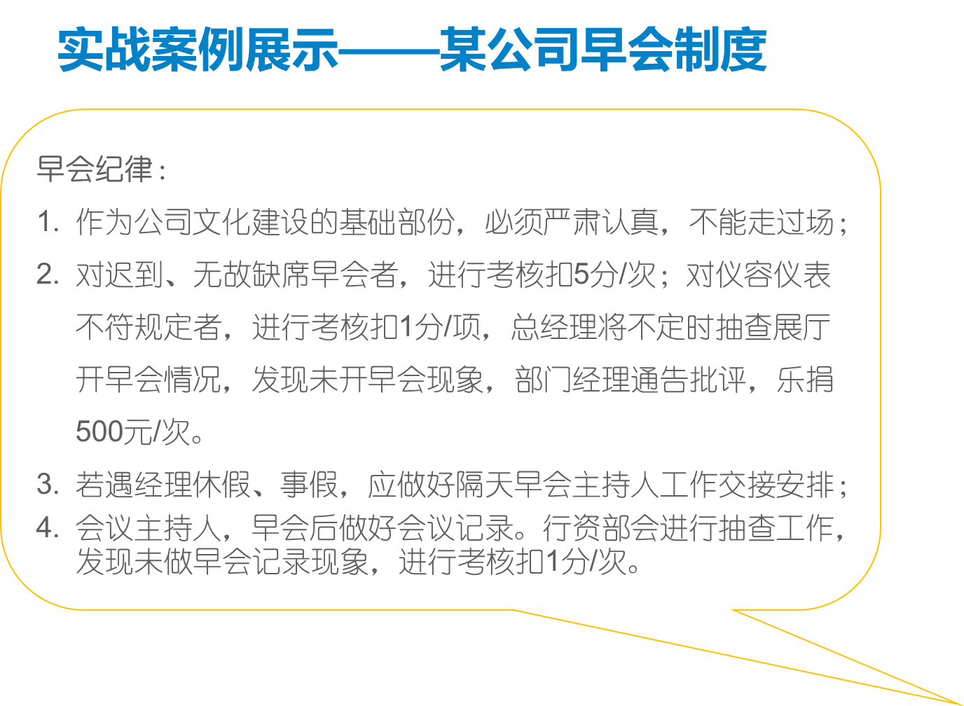 图9-5是某公司的早会制度,像这样的制度是合理合情的。而有的公司动不动就罚款,是不符合劳动法规定的,而这里面的扣分和乐捐制度就有效规避了这些风险。但是在公司的规定里面有可能写的就是罚款,但内训师课程PPT中不会体现这样的字眼。