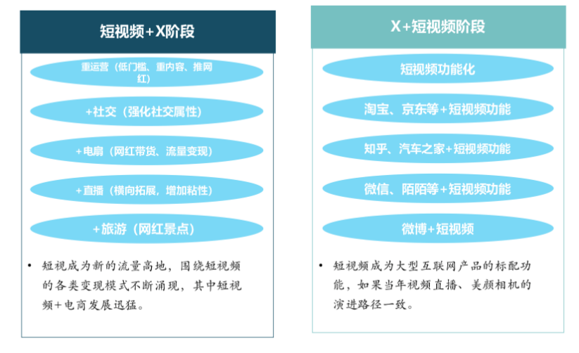 此前短视频业态是创作者基于个体兴趣,依靠个体或者小团队生产制作内容,生产的稳定性、中长期规划能力、商业化能力欠缺。而今涌现了一批头部短视频公司,通过签约等形式和个体内容生产者/网红达成合作,系统地帮助他们解决运营推广、中长期规划以及商业化等工作,即MCN(Multi Channel Network,新媒体创作人联盟形式)化。从专业PGC短视频制作团队,到电商产品短视频展示,再到媒体平台的短视频频道,短视频行业已经从“短视频+X”逐步地发展到了“X+短视频”,短视频已经从平台,开始向各个领域蔓延,垂直领域成为短视频的突破点。如图5–2所示。