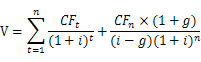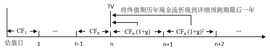 其中,假设预测期共有n期,预测期最后一年现金流为CFn,永续增长率为g,折现率为,则有: