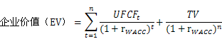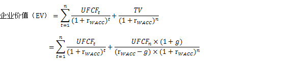 式中,EV为企业价值,TV为预测期末的终值,n为确定的预测期,为确定预测期内第t年无杠杆自由现金流量,g为永续增长率,为加权平均资本成本。