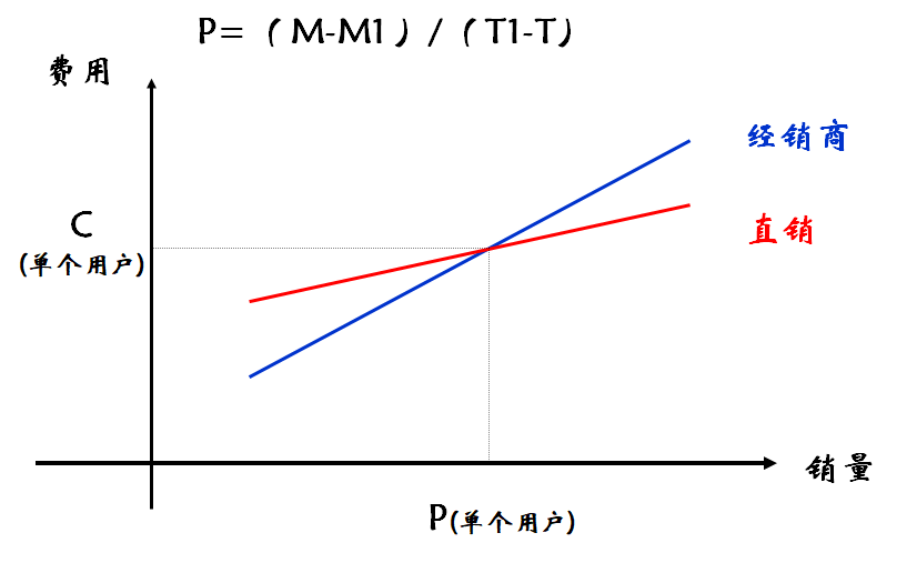 首先,我们对渠道的一个直观感受是,当最终用户很集中、购买量很大的情况下,直销渠道成本更低,B2B行业大客户和项目大都具备这些特征。当最终用户比较分散,在购买量很小、购买频率高的情况下,分销渠道的成本更低,B2C行业或消费品客户大都具备这些特征。这种感觉是正确的,事实上存在两种渠道成本临界点,图1-11说明当单个最终用户的销量超过某个临界点时,直销的成本低于分销的成本。但这只是很简单的计算,如未考虑经销变为直销后物流方式对成本的影响,但可以说明的是最终用户越大越集中越有利于直销,客户越小越分散通过经销商销售更划算。