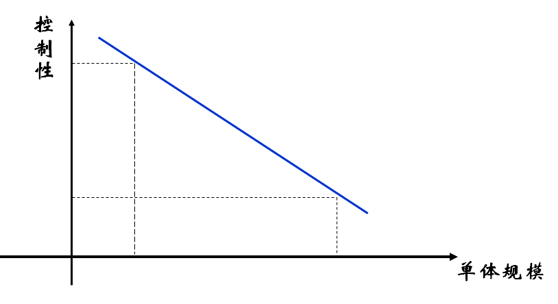 渠道成员是受管理调控的外部关联组织,渠道管理的前提是厂家与渠道成员谁更有话语权。在渠道的规划阶段就设法改变双方的实力对比,有利于厂家掌握更多的主动权。事实上,控制性与渠道层数和经销商单体规模有关,渠道的长度越长,中间的层次越多,厂家对渠道的控制性越差(如图1-12所示),采用自己的直销队伍可控性最高。经销商单体规模越大,可控性越差(如图1-13所示),独家分销更容易造成“客大欺店”,导致厂家管理形同虚设,不利于渠道管理健康有序的发展。如果厂家在自身实力和管理能力有限的情况下,为了削弱渠道成员的影响力,贸然采取渠道下沉选择分销(更多渠道成员)的渠道模式,不但渠道成本大幅度增加,而且容易造成渠道混乱和失控。