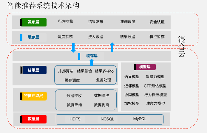推荐系统主要是由六个部分组成的,分别是数据层、特征抽取层、模型层、结果层、缓存层和发布层。