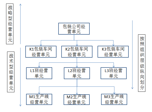 无论是战略型、战术型、职能型经营单元,在按照以上五种维度获得初步划分后(通常是横向划分),还需要进行进一步的细分(通常是纵向划分),才能达到“在能够独立完成业务的条件下,最大限度的化小经营单元”的目的。在细分化小的过程中,常见的划分方式是参照现有的组织层级进行划分。例如,W集团包装车间就是按照组织层级划分为车间级、班组级、生产线级经营单元,见下图: