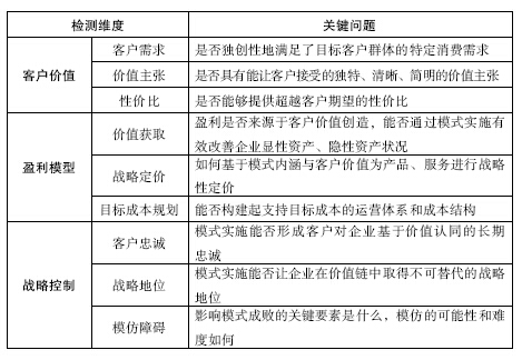 “客户价值”维度重点从客户需求、价值主张、性价比三方面进行检测;“赢利模型”维度重点从价值获取、战略定价、目标成本规划三方面进行检测;“战略控制”维度重点从客户忠诚、战略地位、模仿障碍三方面进行检测(表10-2)。
