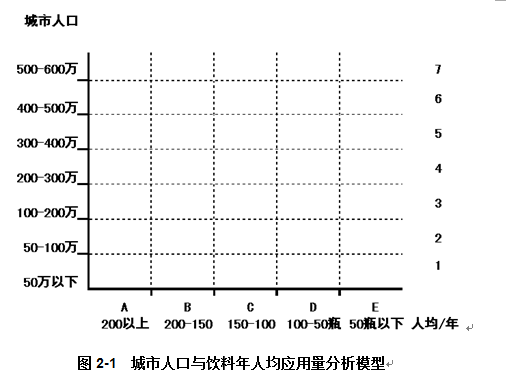 我们以饮料为例,阐明企业应如何根据城市的人口数与饮料的年人均饮用瓶数,进行城市分级。分析模型如下: