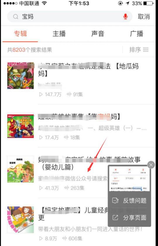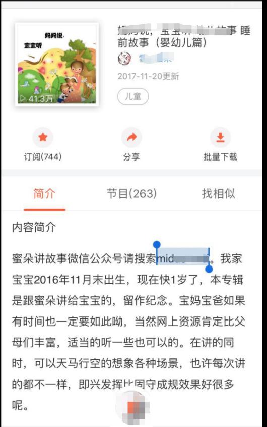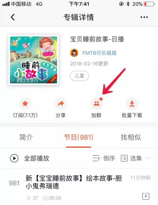 在搜索框输入“宝妈”这个词汇,可以看到一个宝贝睡前故事专辑。鼠标点击进去,能够发现一个加群的按钮,可想而知这个群里的粉丝定位很精准,因为这里有很多学习当“宝妈”的用户,她们的需求是很明确的。这样寻找目标客户比很多盲目加人进朋友圈的方式效果更好。