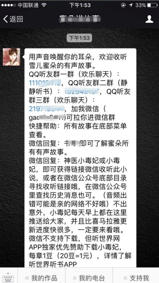 以上就是喜马拉雅系列的“截流法”,同理,很多音频类学习平台里都有这种渠道,进入这些渠道后,千万不要着急发广告,暴露我们的目的。只有让客户对我们产生信任,才能将流量变现。