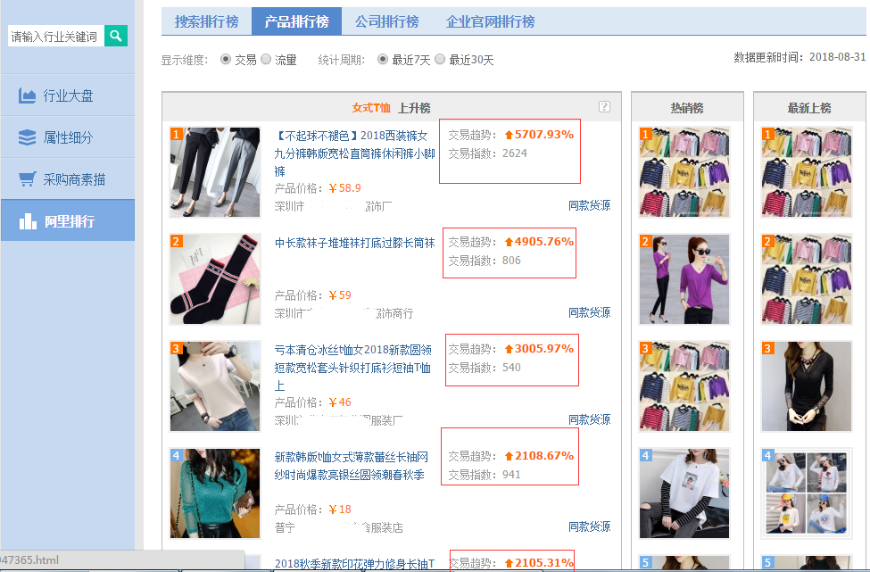 第五,阿里排行。这可是数据分析关于阿里指数的重中之重。除了搜索排行前面说过外,还有产品排行:产品排行分三块——上升榜、热销榜、最新上榜。分析数据主要分析几个点:一是上升榜中的交易趋势及交易指数;二是热销榜中的交易指数、最新上榜的交易指数等。重要的点是:一个星期的指数、一个月的指数。这些都需要算出来,把50个商家的进行相加,如果想要排到50位以内,或者是想要的位置,就必须要数据在这之上或者平均数据之上(具体做法前面已讲述)。如图10-5所示。