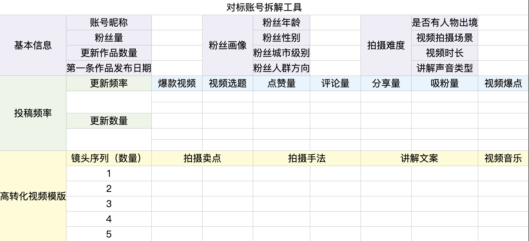 对标账号拆解工具,见表4.2,大家可以依照这些维度进行拆解。