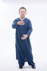 15.右脚底往下踩,带动腰胯向右旋,转正,右手掌浮起于喉结或心窝处处,左手收到丹田处。