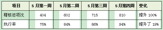 :首先是执行率提升的相关数据,这样就可以衡量执行力了。5月第一周执行率数据是75%,经过一个月,执行率提升了19%,达到了94%,具体如表5-10所示。
