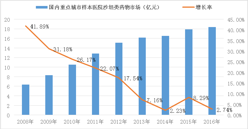 按照南方所数据,国内16个重点城市公立医院样本中沙坦类药物(含复方沙坦制剂)年销售额达到18亿元,占据整个抗高血压样本市场的36%,主流产品为缬沙坦、厄贝沙坦与氯沙坦。沙坦类作为降压一线用药,不但针对高血压作用明确,而且对糖尿病、心力衰竭及肾脏疾病等多种并发症疗效显著,相比其他降压药,具有更高的安全性。如图2-3、2-4所示。