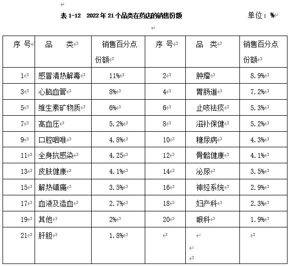 2022年《中国药店》给出了具体类别,大家可以每年度关注这些品种的变化,他们基本上都是您需要关注的对手和队友。大家可以看每年的具体变化,一般中国药店、中康咨询、米内网都会有发布,详细名单自己收集吧。维生素及矿物质类22个,营养健康类4个,补益类13个,补血类7个,补肾类9个,感冒类11个,清热解毒类4个,止咳化痰平喘类5个,口腔咽喉类9个,耳鼻喉类4个,胃药类9个,肠道类4个,便秘泄泻类5个,妇科外用类5个,妇科口服类5个,口服避孕类1个,男性健康类3个,泌尿系统类4个,抗感染类6个,儿童用药类15个,快消品类1个,止疼膏药类5个,皮肤类13个,眼健康类13个,痔疮类3个,风湿类4个,心脑血管类18个,肝胆类4个,糖尿病类5个,抗晕眩止吐类2个,中药饮片类6个,颈腰椎类6个,医疗器械类14个。
