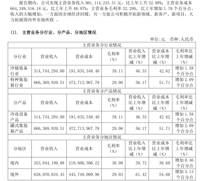 分产品可以看到冷链设备收入增速略低于特种集装箱,但是毛利率高,同时毛利率都是上涨的。分地区看境内收入增速远低于境外,毛利率都增加,但是主要是境外产品毛利率增加。如表1-41所示。