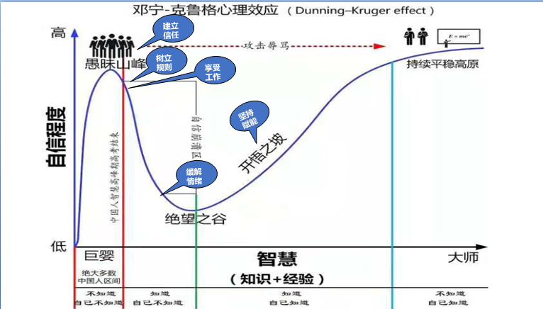 新生代往往在大学毕业的时候处在第一阶段“愚昧山峰”,表现为 “不知道自己不知道”,他们容易自信满满,眼高手低,藐视管理权威,只尊重他们认同的技术大拿。直到在企业工作了3个月到1年的时间,进入第二个阶段“绝望之谷”,表现为“知道自己不知道”,这个阶段新生代特别容易遭受挫折,因为到了企业的具体工作中新生代发现从知道到做到存在巨大的鸿沟,新生代也领悟到 “理想很丰满,现实很骨感”,这时的新生代由于以往较少接受挫折教育,容易产生负面情绪。只有当新生代缓解了负面情绪,重新振作起来后,才可能进入第三阶段“开悟之坡”,表现为“知道自己知道”,在不断的自我赋能和被赋能中,新生代开始真正成长,变得成熟,最后逐步进入第四个阶段 “大师境界”,表现为“不知道自己知道”,处于“大师境界”的人反而非常谦虚,因为真正的大师知道自己在整个世界中是渺小的,表现得更加谦虚和低调。