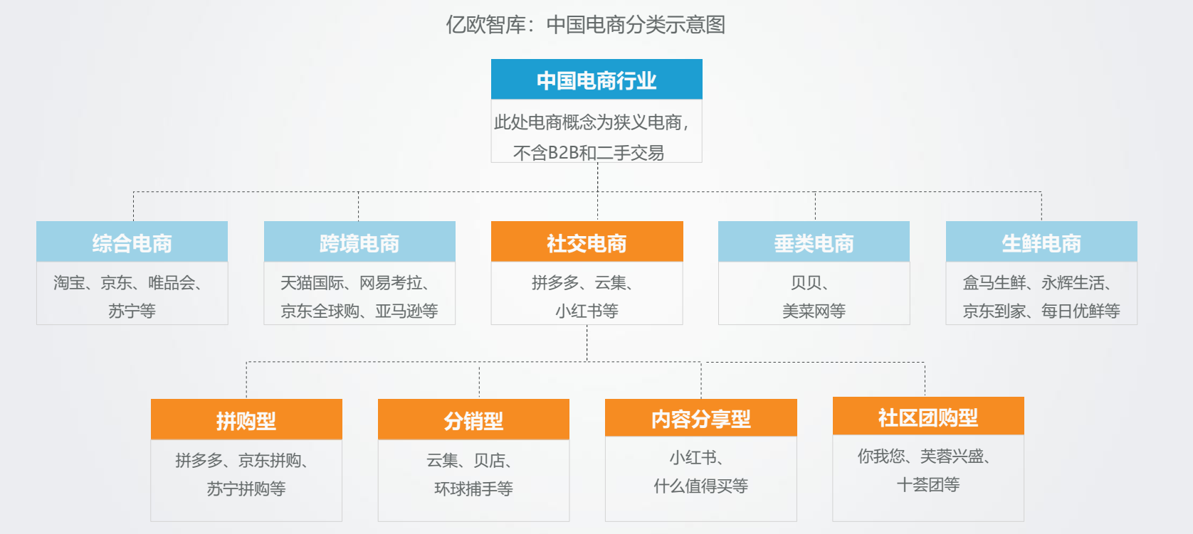 关于电商分类有很多说法,但是我比较认同“亿欧智库”的中国电商分类。如图5-6所示。