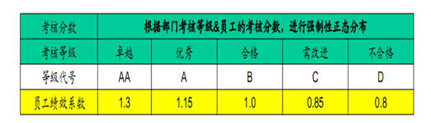 如前面提到的,最高绩效等级对应的绩效考核系数一定要超过1。否则,被考核对象会感觉公司通过绩效考核将自己的工资扣除了一部分。不过,比较遗憾的是不少企业在实施绩效薪酬的时候没有遵循这个原则,员工排斥绩效考核,最终导致绩效考核失败。绩效考核失败的企业就错误地认为绩效考核本身有问题,从此不再实施绩效考核。实际上,不是绩效考核本身有问题,而是企业没有设计出好的绩效考核方法,没有正确实施绩效考核而已。