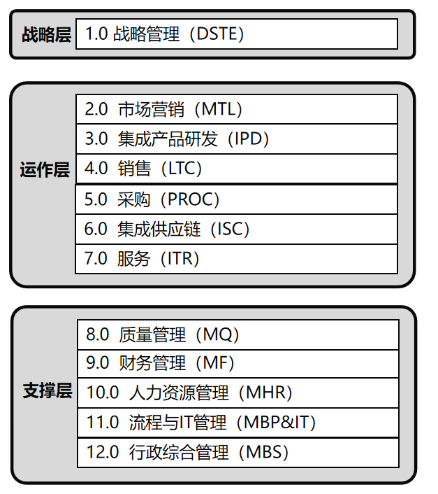 1 | POS | P(plan):关注全局性、长远性、基本性,面向整体,如战略/策略、规划/计划、预算、政策、制度等 O(operation):提供的业务行动可促进企业的价值实现,它强调保证员工的负荷和生产效率 S(support):监控业绩、管理例外情况并发挥着看管资产和信息的作用,为运作类流程提供资源/服务等支持 | 适用于各类1级流程总体框架的搭建 |