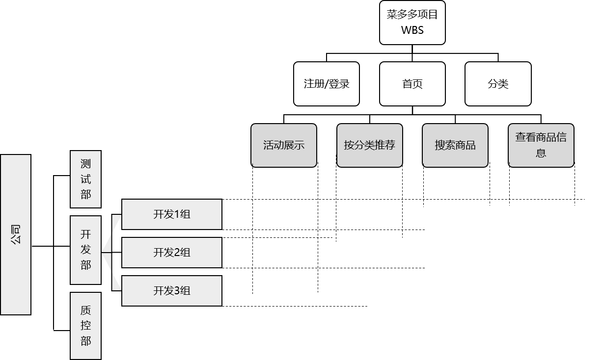 组织分解结构(Organizational Breakdown Structure,简称OBS),此图表是对项目组织的一种层级描述,展示了项目活动与执行这些活动的组织单元之间的关系。WBS显示项目可交付物的分解,而OBS则按照组织现有的部门、单元或团队排列,并在每个部门下列出项目活动或工作包。开发部只需要找到其所在的OBS位置,就能看到自己的全部项目职责。如图8-8所示。