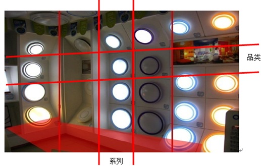 在终端陈列中一定要杜绝两种现象:一种是产品缺失,另一种是样品老化或者损毁。样品缺失给人的印象是清盘甩卖、不再经营或者是卖给顾客旧货;样品老化或者损毁给顾客产品品质不好的印象和联想。好的陈列自身会说话,它就是终端的活广告。另外,要用灯光烘托、突出产品陈列,使产品展示在终端显得与众不同,让消费者在卖场中一眼就看到我们想突出的产品。如图5-2(亮灯部分)所示。