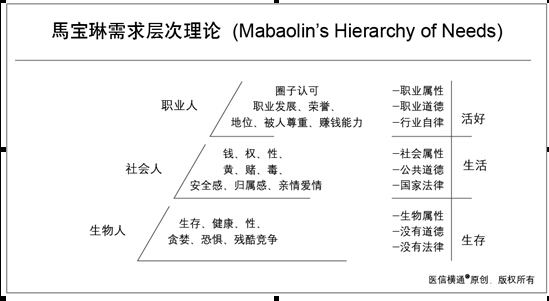(5)目前社会热议的很多人“见死不救”“某某人勇斗歹徒多人围观无人援手”等现象,是混淆了社会人和职业人的不同属性的结果。汶川大地震时期的“范跑跑事件”和“王石捐款事件”也是混淆了生物人、社会人和职业人所具有的人性、社会道德和职业道德的结果。一会儿说医生是“白衣天使”一会儿又说是“白狼”,是不断用社会人和职业人的双重标准交替评价医生的结果。