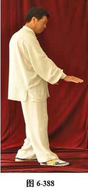 接上式,腰微拱重心移落左腿,身体后倚,两臂随之向左胯下捋;腰向左微转,身体随之转向朝东北方向,两臂由捋随身转向东北方向圆撑;右腰微提,随之提右膝抬腿,向东北方向上步;左腰微提,左膝提起,左腿向左前迈进一步,面向东北,呈左弓步圆掤;腰微含重心移落右腿,随即腰上提,两臂随腰含上提之际,向里翻转外旋,左手经胸前向左上方弧形上掤,掌心翻转向外;右手外旋,掌心向外,重心落于左腿,呈左弓步;左手掌随腰上提向上架掤于左额前,右掌由胸前里旋翻向前推掌,眼神向前平视(见图6-388至6-390)。
