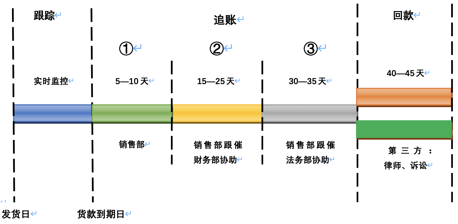 以上连环追款流程,从货款到期日起算至收回货款,共计花费时间约45天,在我司可接受范围内,超出天数回款的将根据情况暂停发放工资,情节严重的给公司财产造成损失的将根据坏账多少来承担一定比例的罚款;