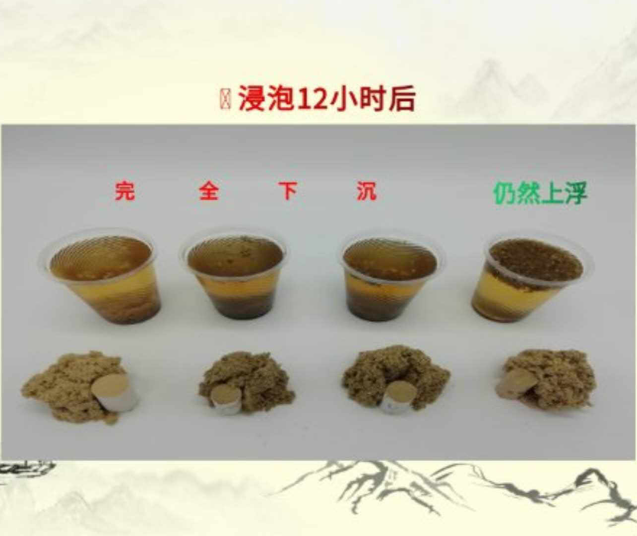 6.好艾灸和差艾灸放到盛有水的杯子中,浸泡12小时后,好艾灸的艾绒依然上浮,差艾灸的艾绒完全下沉。如下图所示,大家都可以试验一下。