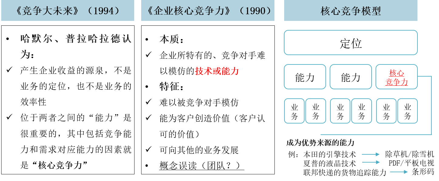 今天,核心竞争力已经成为以及耳熟能详的概念,它来自哈默尔和普拉哈拉德提出的“核心能力理论”。
