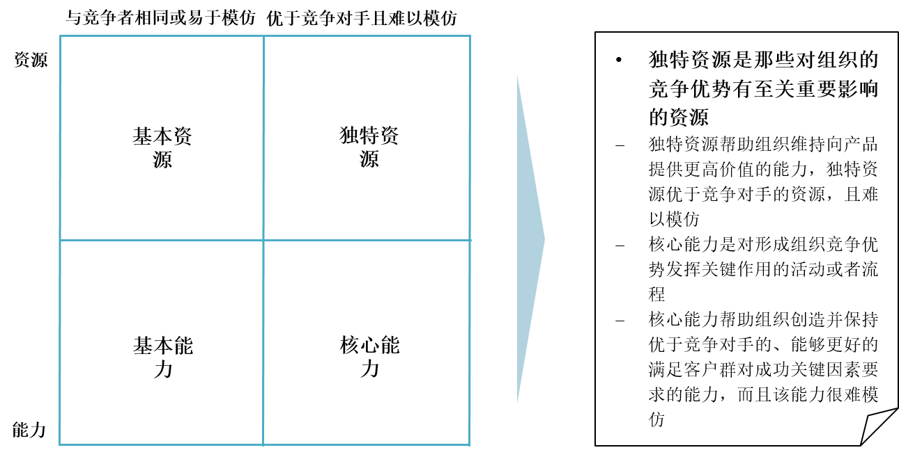 在展开内部分析(看“自己”)方法之前,简要回顾一下战略管理理论上重要的两个理论——资源基础观和核心竞争力,这两个理论对深刻认识企业自身有很大的帮助。