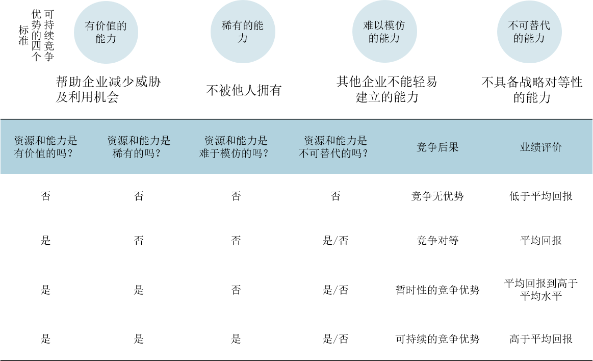 第三步,进一步识别出有价值的、稀有的、难以模仿的和不可替代的能力(资源和能力成为核心竞争力的四个标准,如图9-4所示)。根据“竞争力理论”,这些能力是企业成长乃至多角化发展的基础。