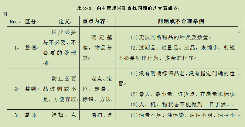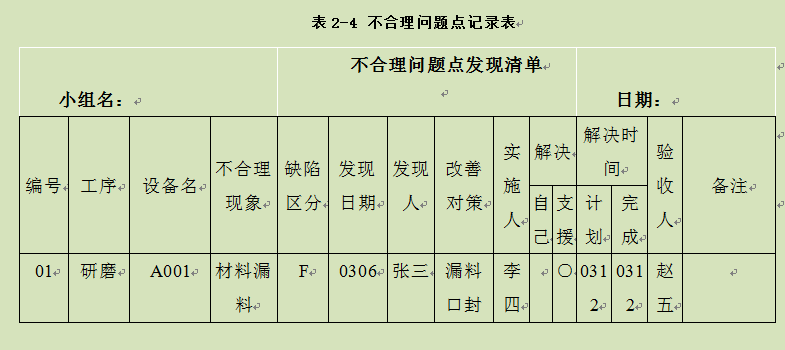 初期清扫活动从以下8个方面(如表2-3所示)出发,识别生产现场存在的一切不合理问题点,并将发现的不合理问题记录在指定的“不合理问题点记录表”(如表2-4所示)表格中。