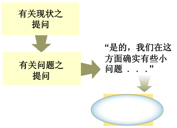 另外,很重要的一点是问题型提问是有的放矢,必须以产品优势为出发点,寻找只有你的产品能解决的或者竞争者花更高成本才能解决的问题。如果价格不是你的优势,你肯定不会问这样愚蠢的问题:“是不是感觉预算有点紧啊?”提问不是漫无目的,要有一定的逻辑,你的提问一定是奔着某个目的去的,为接下来的解决方案埋下伏笔。