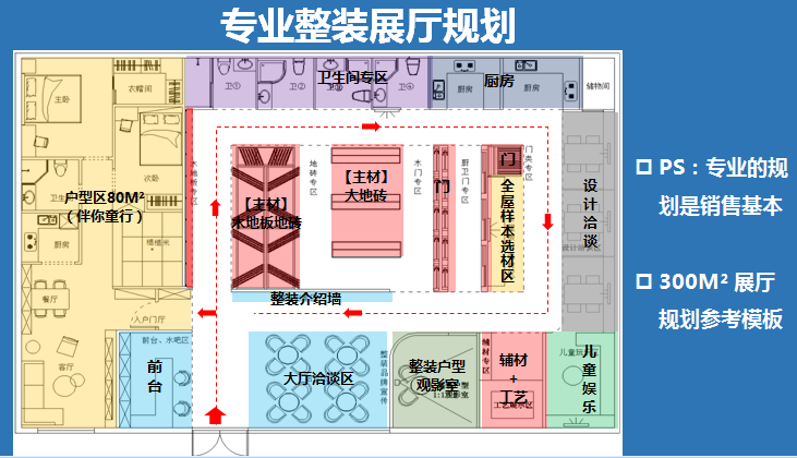粗看这些动线和展示区没有啥特别之处,如果细细品味,就发现有很多创新之处。这里强调一点,装修公司动线设计最好是回型,最大利用空间,让客户看到更多的陈列,差一点的是U型,再差一点的是L型,其他左右分的完全不能考虑。