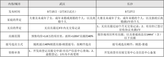 再看看武汉和长沙的人才新政中的购房政策对比,不得不说,两座城市间火药味十分浓厚。在无房上的界定,武汉相对严格,要求3年无房产交易记录;长沙则较为宽松,1年内无记录即可。在房源范围与选房优先顺序方面,长沙也是十分给力,所有“限地价竞房价”项目,建面144㎡及以下的房源,均必须先满足刚需;而武汉限定新建项目备案价格1.8w/平以下,建面120㎡以下,随机选取不少于40%比例房源提供给刚需优先选房。
