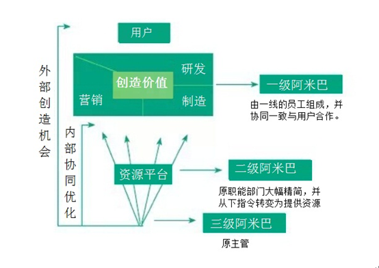 这样一来,就彻底颠覆了原来的“正三角组织”。组织的决策由一线员工与用户零距离接触后发起,原来的管理者则必须要提供资源进行匹配。