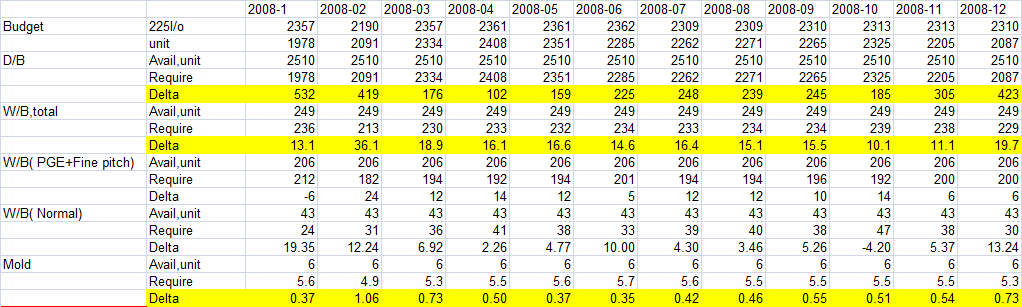 不同的工序决定标准工时的特征值不一样。贴片工序可以按“颗”计算能力;打线工序是按照产品的连线个数;MOLD工序是根据产品大小相关;粘球工序与产品大小相关。由于在这些工序中,打线工序的设备台数最多,投资最大,因此按照最初的产品组合设定了设备组合,设备的ASU是反推出来的。 例如最初产品多数是225根线,因此大约1台DB对应10台WB设备。 但当单个产品的线数从225增加到450根,每个产品WB的工时就上升一倍,但D/B等工序单个产品的工时并没有变化。产品线数没变,还是225根线,当面积减少一半,每条框架上容纳的产品就多了一倍,后线的MOLD等工序的单个产品工时会缩小一半。
